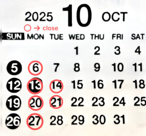 2025年 10月の定休日になります。